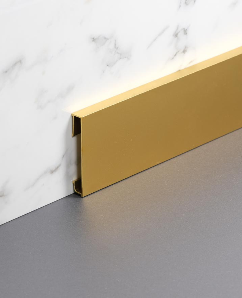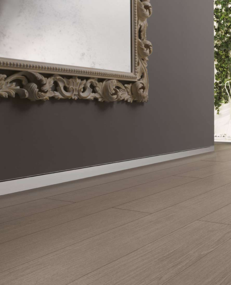 Plinte minimaliste cu secțiune dreptunghiulară, disponibile în trei înălțimi. Designul include o zonă posterioară pentru aplicarea curată a adezivului și accesorii de îmbinare, asigurând o integrare discretă în amenajările moderne.