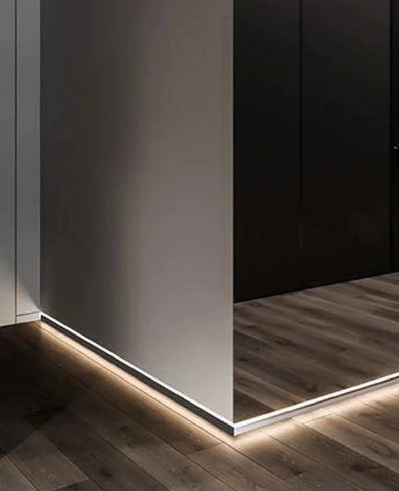 Plinte coplanare integrate în structura peretelui. Șina de bază se montează la nivelul tencuielii, iar rostul orizontal de 5 mm oferă un aspect rafinat și preia diferențele de nivel ale pardoselii.
